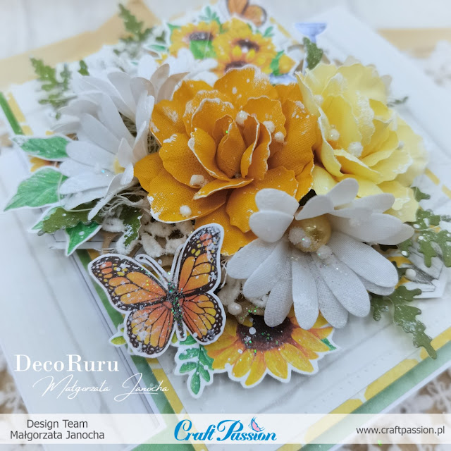 Is yellow the color of joy for you too? That's why it's great for birthday cards, for example. I used the Bee Happy collection to make this card, which I decorated with handmade fabric flowers, combining the latest daisy die with the older "flowers #13" design. I also used dies for a round napkin, the inscription "Happy Birthday" and ferns. Here and there, I inserted elements cut out of sheets with accessories and pieces of lace. I lightly whitened the whole thing, splashed it and added some balls and glitter.This easel-step card can be arranged so that the inscription is visible or hidden, which in my opinion makes it more interesting than the traditional form.